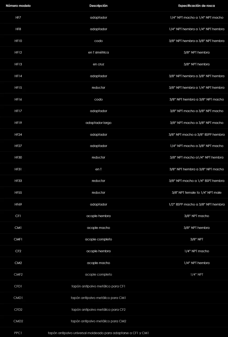 Los acopladores y accesorios de alta presión Hi-Force están diseñados para facilitar la conexión y el montaje de sus equipos hidráulicos Hi-Force. Todos los acopladores y accesorios Hi-Force son aptos para una presión máxima de trabajo de 10 000 psi. Hi-Force recomienda el uso de tapones roscados con acopladores de conexión rápida para proteger la rosca del acoplador y, al mismo tiempo, evitar la entrada de contaminantes en el sistema hidráulico. Siempre especifique acopladores y accesorios Hi-Force para sus herramientas hidráulicas Hi-Force.