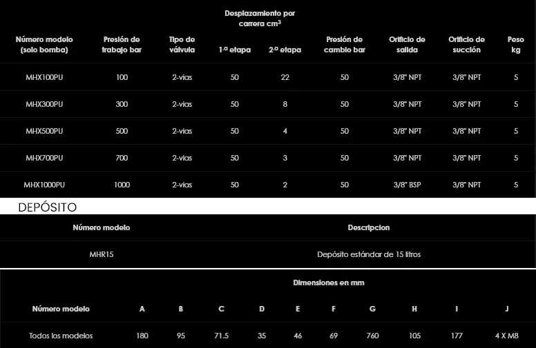 La serie MHX-PU ofrece las mismas características que la serie MHX con la diferencia de que éstas se suministran como unidad de bomba, sin el depósito de fluido. La bomba se suministra completa con un kit de montaje para acoplar fácilmente cualquier depósito de fluido diseñado especialmente, y una palanca de accionamiento.
