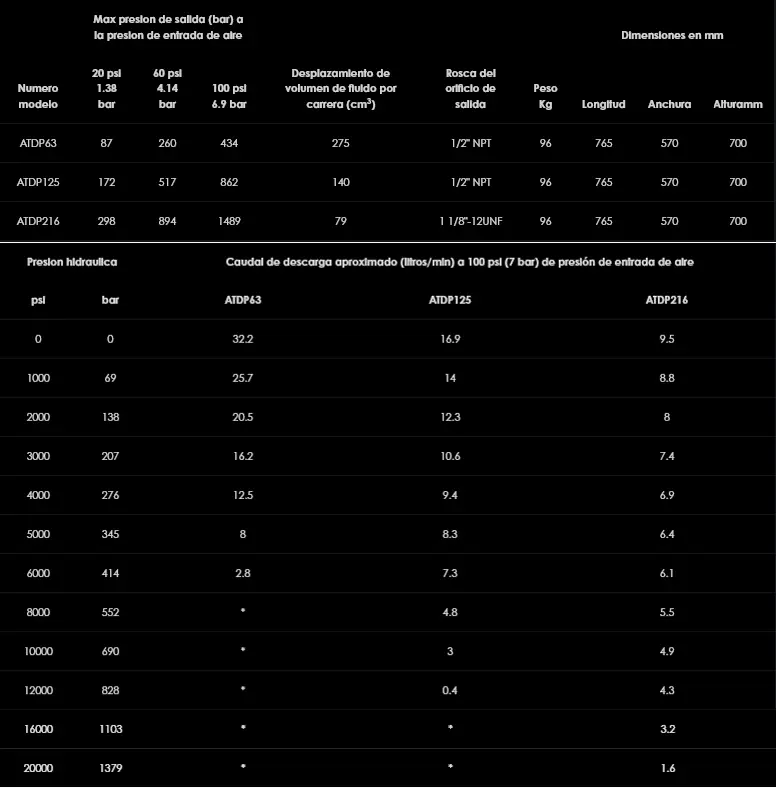 Las bombas neumáticas dobles de doble efecto para pruebas hidrostáticas ATDP son 3 modelos con presiones de salida desde 87 bar (1260 psi) hasta 1489 bar (21600 psi). El diseño doble de doble efecto desplaza mucho más volumen por carrera que las series más pequeñas AHP y AHP2 lo que las hace ideales para un prellenado y para las pruebas de presión. Todas llevan manómetro anti vibratorio de glicerina de 150 mm de diámetro (calibrado a petición del usuario), unidad filtrante, reguladora de presión y lubricante del aire de entrada en la línea de aire comprimido, válvula de arranque y de parada y para entrada de fluido.