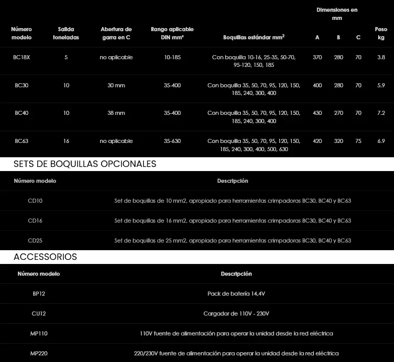 La serie BC de crimpadoras con batería consta de 4 modelos con opción de diseño de garra abierta en “C” o de guía paralela, que incorpora una cabeza giratoria de 360°.