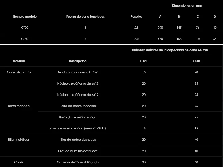 Equipadas con cuchillas de corte de acero de alta calidad, las cortadoras de la serie CT pueden cortar una variedad de materiales, incluidos cables de acero, barras redondas, hilos de alambre y cables de hasta 40 mm de diámetro. Los cortadoras autónomas CT son compactas y livianas, y cuentan con manijas de agarre ergonómicas para minimizar la fatiga del operador.
