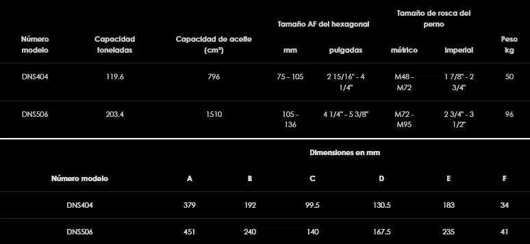 La serie DNS de cortatuercas hidrálicos de doble efecto consta de 2 modelos adecuados para cortar tuercas de tamaño AF de 2.15/16” a 5.3/8” (75 mm a 136 mm). Ambos modelos tienen una presión máxima de trabajo de 700 bar y un pistón hidráulico de doble efecto para una extensión y un retroceso fáciles de la cuchilla cortantes de acero endurecido. Los cortatuercas hidráulicos DNS de Hi-Force se colocan fácilmente y cortan tuercas de forma segura y rápida sin las chispas, llamas o los residuos que suelen saltar cuando se utilizan los sopletes.