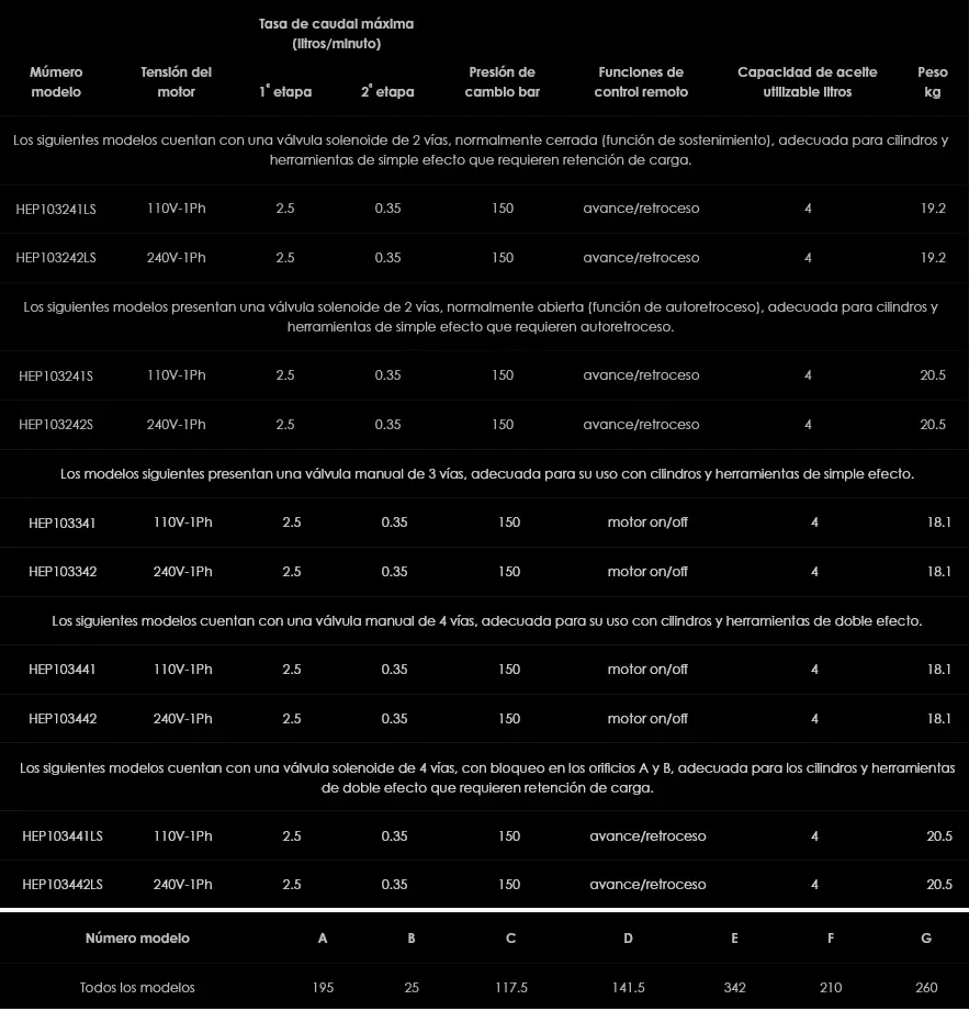 La serie HEP103 de electrobombas hidráulicas de dos etapas es adecuada para una gran variedad de operaciones y son bombas con motor eléctrico monofásico de 110 voltios o de 240 Voltios. Ambas opciones de tensión ofrecen además válvulas de control manuales o eléctricas de 2, 3 o 4 vías con características adicionales disponibles como diseños de válulas de centro abierto, centro cerrado y válvula de bloqueo. La presión máxima de trabajo es de 700 bar con cambio automático de baja presión a alta presión, de serie. Todos los modelos se suministran completos con un manómetro hidráulico de glicerina, un depósito lleno de 4 litros de aceite utilizable con indicador visual de nivel de aceite y un asa transportadora integrada para el fácil transporte de estas bombas ligeras, compactas y versátiles al lugar donde deban utilizarse.