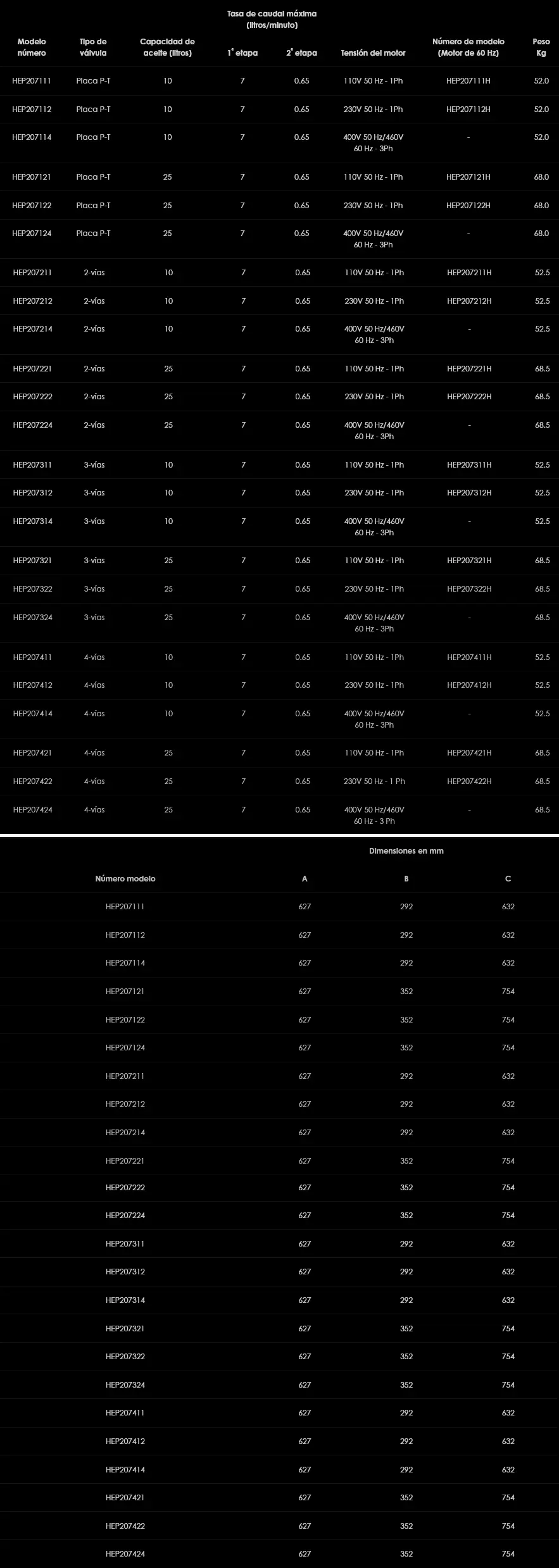 La serie HEP2 de electrobombas hidráulicas de dos etapas ofrece un caudal a baja presión de 7 litros/minuto con un cambio automático a un caudal a alta presión de 0,65 litros/min, hasta 700 bar, con opción de motores de 110, 230 or 400/460 Voltios. Con opciones de válvula eléctrica solenoide o manual de 2, 3 o 4 vías, la serie HEP2 es adecuada para una gran variedad de aplicaciones, y es la bomba eléctrica de Hi-Force más elegida. Todas las bombas de la serie HEP2 van provistas de una válvula de alivio ajustable externamente por el usuario para un fácil ajuste de la presión de trabajo de hasta 700 bar.