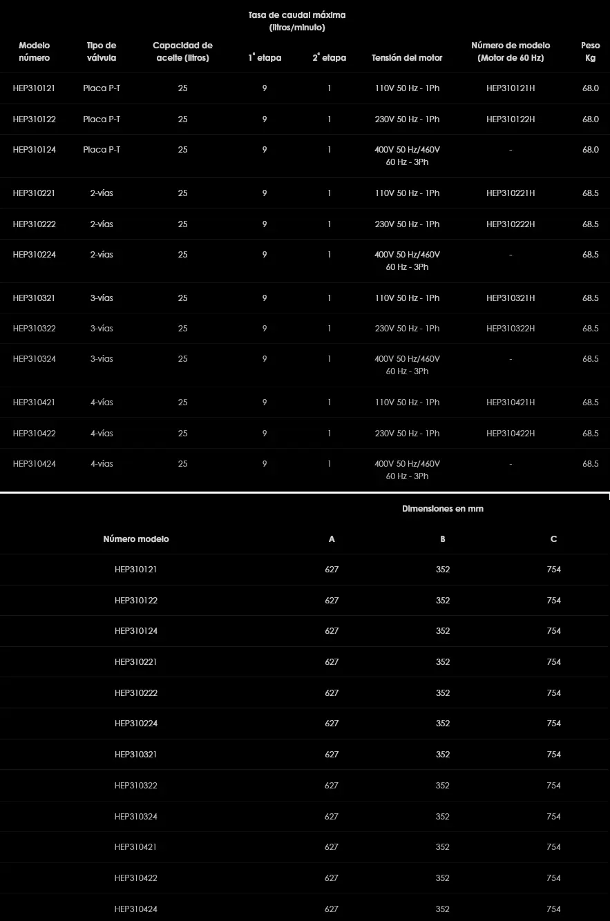 Las electrobombas hidráulicas HEP3 de dos etapas son como las HEP2, pero con un caudal aumentado de 9 l/min a baja presión y 1 l/min a alta presión (hasta 700 bar). Estas bombas son especialmente útiles con cilindros para gran tonelaje o de largo recorrido. La serie HEP2 y la HEP3 de electrobombas incluyen motores eléctricos totalmente cerrados con ventilador y de bajo nivel sonoro, lo que las hace ideales para producir poco ruido en interiores o para la mayoría de ambientes exteriores.