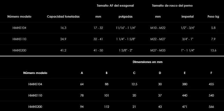 Los cortatuercas hidráulicos HMNS son 3 modelos aptos para tuercas hexagonales de 17 a 50 mm de tamaño AF (tamaños de perno M10 a M33). Su diseño de carcasa en ángulo les proporciona el espacio necesario sobre las bridas y las superficies planas. Su acoplamiento de acero endurecido garantiza que el borde cortante de la cuchilla esté paralelo a la tuerca durante todo el corte lo que mejora el rendimiento y lo que es más importante, la vida útil de la cuchilla. Cortan fácilmente tuercas corroídas de hasta RC44 de dureza y son la solución idónea de ‘corte en frío’ para extraer pernos estropeados o corroídos, especialmente en operaciones en las que no se conceden permisos para trabajar en caliente. Se suministran con bomba hidráulica integrada con palanca multiposicional, lo que le da incluso mayor versatilidad.