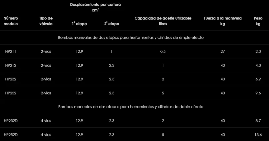 La serie HP de bombas manuales de aluminio ofrece un funcionamiento a dos velocidades, y todos los modelos vienen incluyen un depósito de aceite lleno, listo para su uso inmediato. Todos tienen una presión máxima de trabajo de 700 bar y la serie incluye modelos de bombas adecuadas para cilindros y herramientas de simple efecto y de doble efecto. La serie HP es la solución ideal para operaciones en las que es necesaria una potencia hidráulica portátil y autónoma. En todos los modelos se acciona la manivela con poco esfuerzo para un funcionamiento sencillo, son de diseño ligero y su construcción es resistente y duradera. Las bombas manuales HP de Hi-Force tienen un historial probado en todo el sector y su relación calidad-precio en potencia hidráulica portátil, es excelente.