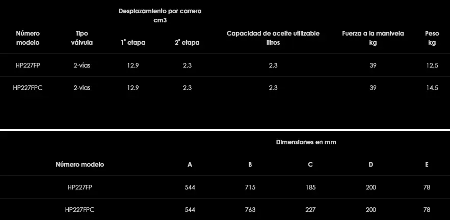 La bomba HP227FPC, accionada con el pie, se suministra completa con manómetro de 100 mm de diámetro, soporte del manómetro y manguera hidráulica de 3 m con un conector rápido macho CM1. Es idónea para utilizarla con las cabezas de crimpadoras de la serie CH de Hi-Force y todas las demás herramientas hidráulicas con presión de hasta 700 bar de Hi-Force que necesitan funcionar con bomba externa. La HP227FPC tiene un magnífico desplazamiento en dos etapas: a baja presión (12,9 cm3 por carrera) y cambio automático a alta presión (2,3 cm3 por carrera) hasta 700 bar. Se suministra con depósito de aceite lleno con capacidad de 2,3 l para uso inmediato.