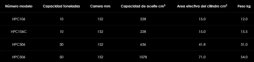La serie HPC de cilindros de tracción consta de cuatro modelos, con capacidades que van desde las 10 toneladas hasta las 50 toneladas de fuerza de tracción. Todos los modelos tienen una presión máxima de trabajo de 700 bar y tienen un pistón de simple efecto y de retorno por muelle, con una longitud de carrera de 152 mm. Llevan incorporados unos ojos de tracción mecanizados en el vástago del pistón y en la base del cilindro fácilmente reemplazables; la versión de capacidad de 10 toneladas puede suministrarse además con accesorios de ojos de horquilla. Las operaciones típicas para los cilindros de tracción HPC son la alineación de chapas previa a su soldadura en astilleros, el tensado de cables y el movimiento de cargas pesadas mediante cadenas o cables de acero.