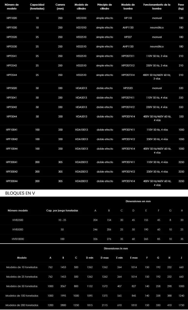 Los modelos de prensa HPF cuentan con una estructura de acero resistente e incorporan una mesa de trabajo ajustable, con ajuste adicional del cabezal superior en todos los modelos a partir de 50 toneladas de capacidad. Todos los modelos se suministran con manómetro hidráulico de doble escala para mayor seguridad y control de la carga. Los accesorios opcionales instalados de fábrica incluyen bloques en V multiposicionales, con superficie plana y superficies de prensado en forma de “V”