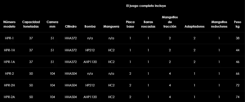 La serie HPR de kits de reemplazamiento de ejes y rodamientos de Hi-Force, ofrece opciones de capacidad de 37 o de 50 toneladas, ambas con opción extra de bomba hidráulica manual o neumática. Los usuarios que ya tengan una bomba adecuada capaz de dar 700 bar de presión pueden adquirir tanto el HPR-1 como el HPR-2 sin la bomba. Todos los modelos trabajan a una presión máxima de 700 bar y llevan de serie un ligero cilindro hidráulico de aluminio HHA372, de 37 toneladas de capacidad o el HHA504, de 50 toneladas de capacidad.