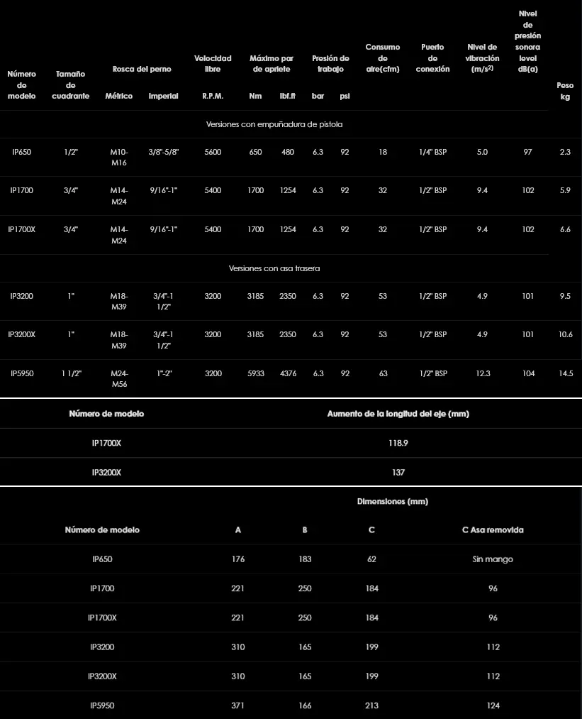 La serie IP de llaves de impacto neumáticas de alto desempeño está diseñada para trabajos de gran volumen de producción, mantenimiento pesado y construcción. Con una opción de cuatro modelos en tamaños de cuadrante desde ½” hasta 1½”, las llaves de impacto IP ofrecen un funcionamiento silencioso con bajos niveles de vibración y mayor par de torsión de hasta 5933 Nm.