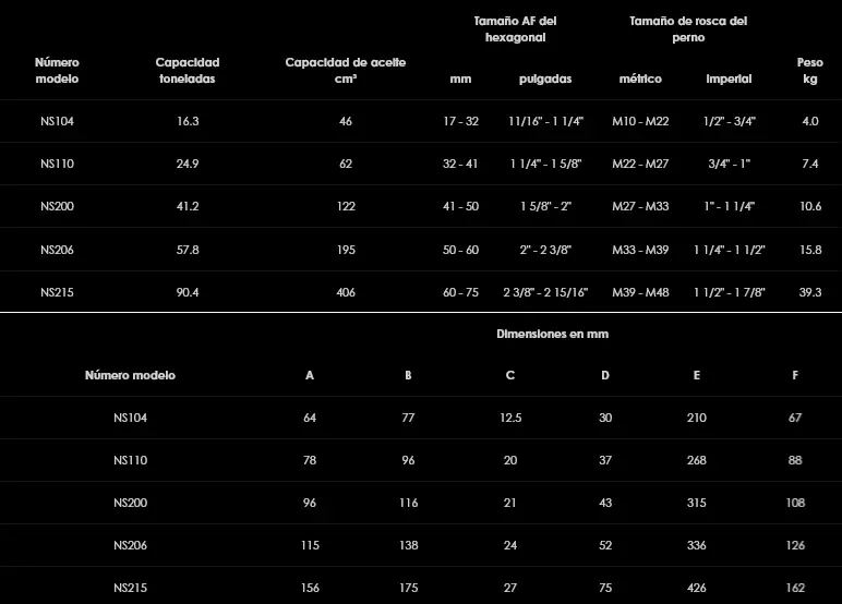 La serie mejorada de cortatuercas hidráulicos NS ofrece 5 modelos aptos para tuercas hexagonales de 17 a 75 mm de tamaño AF (tamaños de perno M10 a M48). El revolucionario diseño incluye un acoplamiento de acero endurecido para mantener el borde cortante de la cuchilla paralelo a la tuerca durante el corte lo que mejora la eficiencia de funcionamiento y lo que es más importante, la vida útil de la cuchilla. Los cortatuercas de Hi-Force, que cortan fácilmente tuercas corroídas de hasta RC44 de dureza, son la solución idónea de ‘corte en frío’ para extraer pernos estropeados y corroídos, especialmente en operaciones en las que no se conceden permisos para trabajar en caliente.