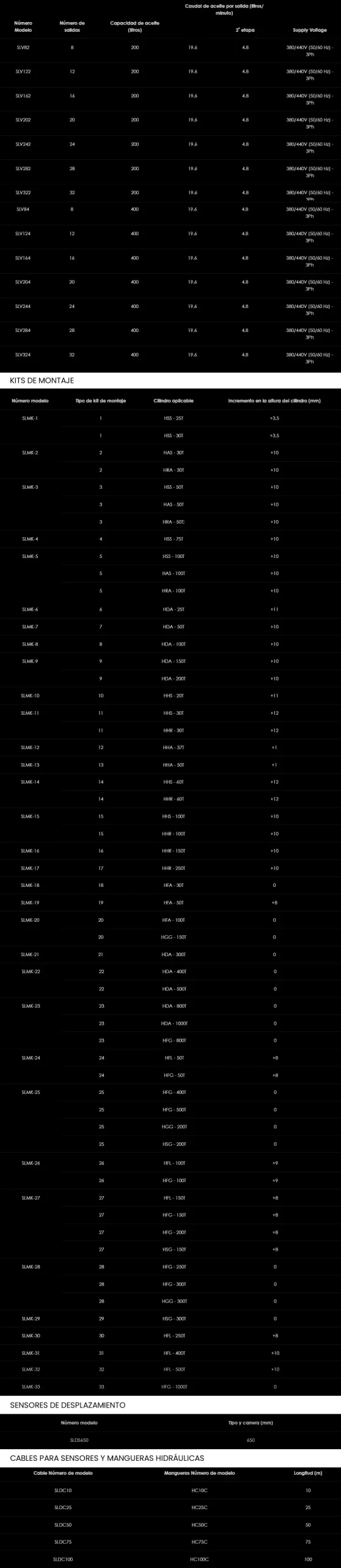 La gama SLV ha sido diseñada para la elevación precisa y descenso de cargas pesadas usando múltiples cilindros hidráulicos sincronizados. El sistema incluye un motor eléctrico trifásico, panel de control del operador para monitorear hasta 32 canales y un marco robusto para el transporte y almacenaje del sistema completo.