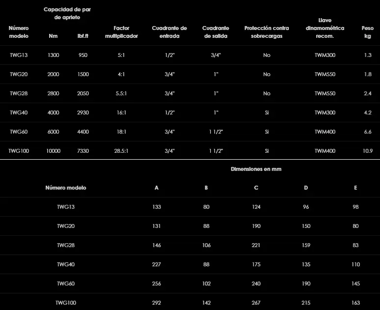 Los multiplicadores de par mecánicos de la serie TWG de Hi-Force ofrecen capacidades de par de apriete de 50 a 10.000 Nm con factor de multiplicación de las cajas de engranajes de 1:4 a 1:28,5. Hay 6 modelos disponibles, todos ellos con una carcasa de aluminio de alto rendimiento e idóneos para aplicaciones de apriete de pernos en muchos sectores, como el de gas y petróleo, construcción, ferrocarril, astilleros, e ingeniería de equipos y de plantas.