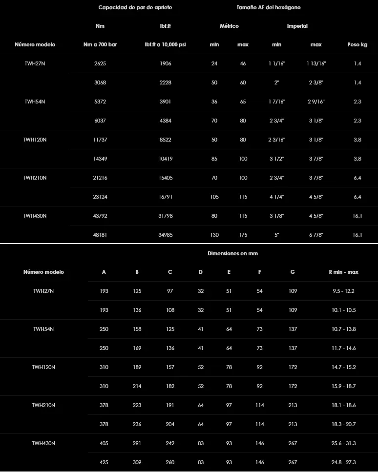 La serie TWH-N de llaves dinamométricas hidráulicas de salida hembra hexagonal de Hi-Force consta de 5 modelos, con capacidades de par de salida de 2625 a 48181 Nm (1906 a 34985 lbf.ft). Todos los modelos se fabrican en aluminio de alta calidad (excepto TWH430N) y proporcionan una reacción lineal directa y un mínimo radio de giro para ajuste en espacios reducidos. El diseño de fácil manejo de la herramienta permite al usuario cambiar la cabeza de trinquete con sólo sacar o meter una clavija. Las cabezas de trinquete están disponibles en todos los tamaños estándar métricos e imperiales AF de 24 a 145 mm (1 1/16” a 6 7/8”) con casquillos reductores hexagonales de bajo coste también disponibles.