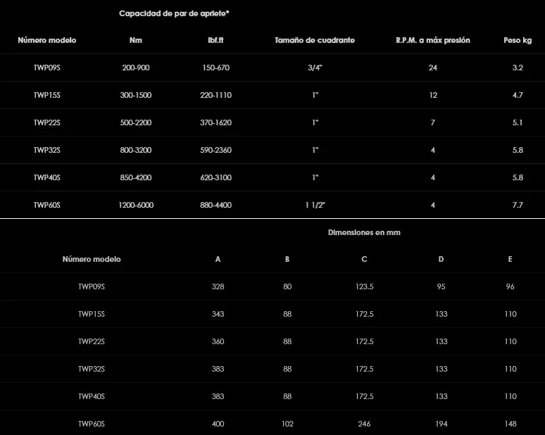 La serie TWP de multiplicadores de par de pistola neumática está diseñada para conseguir operaciones de apriete de pernos suaves y controladas, sin percusión y no pulsantes. Ofrece una repetición de precisión en el par de apriete de +/- 5% y esta serie de herramientas ligerísimas y de bajo nivel sonoro reduce la fatiga del usuario, aumenta la seguridad y garantiza un apriete rápido y consistentemente preciso de componentes atornillados. El potente pero ligero motor neumático reversible en forma de pistola es adecuado para operaciones de apriete y aflojamiento de pernos. El diseño anti-percusión de los engranajes planetarios garantiza un mínimo desgaste de las bocas y de los componentes atornillados. La superficie electrogalvanizada de la caja de engranajes de acero de alta calidad ofrece una mayor protección anti-corrosión y reduce la importancia de la lubricación en la caja de engranajes. Todos los modelos se suministran con una unidad de control del lubricante y de la presión de la tubería de aire comprimido en una cómoda estructura portátil y una manguera de conexión de 3 metros de longitud con acoplamientos rápidos. La repetición de par, precisa, consistente, y preestablecida se puede obtener fácilmente ajustando la presión de la entrada de aire a la herramienta, de acuerdo con la tabla de calibrado suministrada con cada herramienta. El consumo medio de aire es de 23 litros por segundo con una presión estándar en la tubería de 8 bar (49,5 pies cúbicos por minuto a 116 psi).