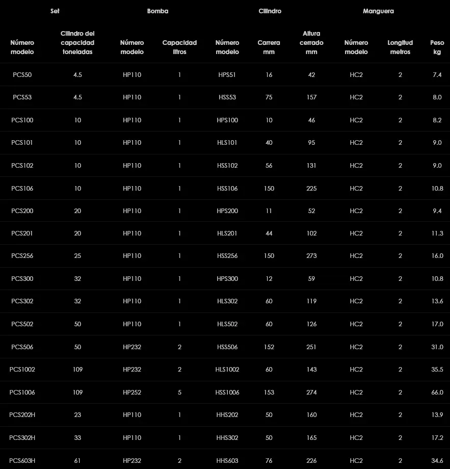 Selección de 18 modelos de sets de bombas, cilindros y mangueras