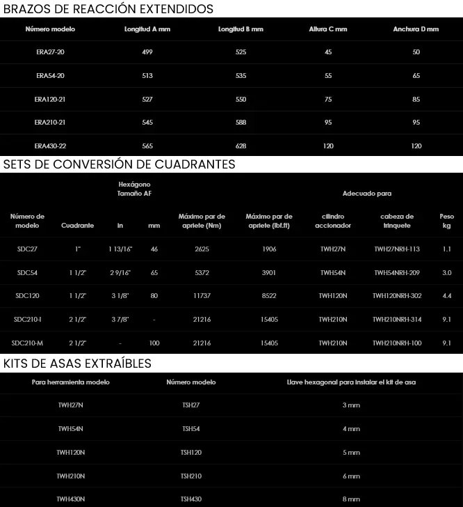 Fabricados en aluminio, los brazos de reacción extendidos de poco peso ofrecen reacción lineal fuera del rango de puntos de reacción estándar, incrementado así la accesibilidad de las llaves TWH-N para aplicaciones en espacios confinados.